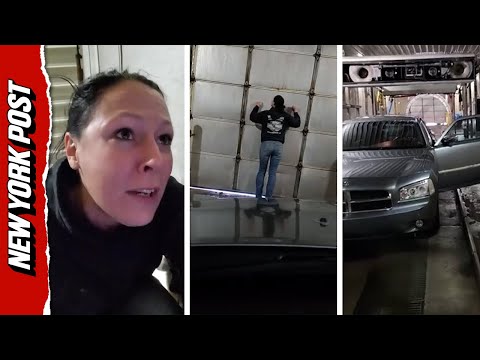 The claustrophobic mishap was recorded by Felicia Sullivan, who told Storyful that she documented the incident in case her car was damaged or she was hurt “while stuck in there.”